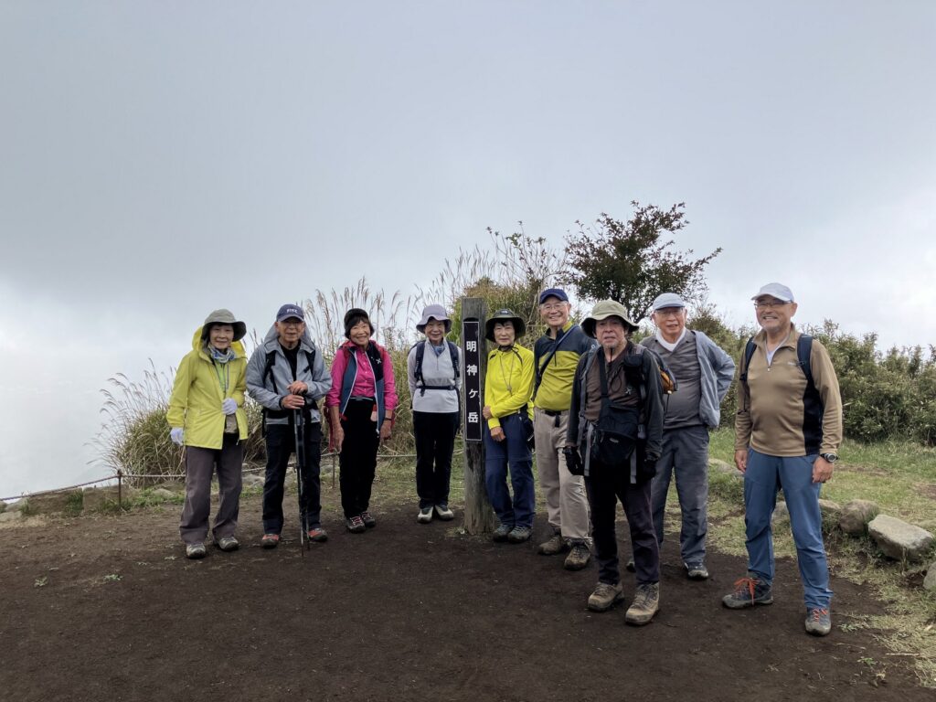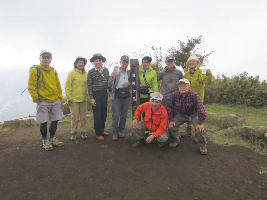 伊豆箱根鉄道大雄山線の大雄山駅に集合、バスで登山口の道了尊に移動し3班に分けて出発する。最乗寺の杉林から山道を登る。明神ヶ岳見晴小屋(廃屋)を過ぎ穏やかな草原の道となる。明神ヶ岳東面を巻きながら稜線に出た。そこからわずかに登ると明神ヶ岳の展望台に到着した。晴れていれば大涌谷や金時山、その後ろに富士山が見えるはずであるが残念ながら展望はない。稜線を戻り宮城野へ下山した。宮城野から強羅までの登り返しシャトルバスで宿泊先に入る。