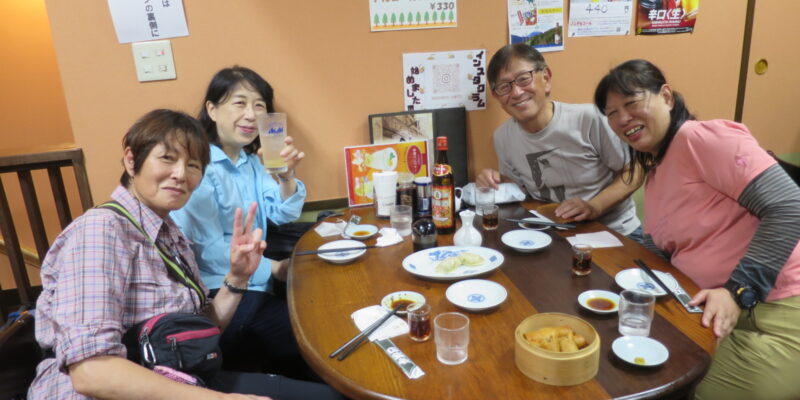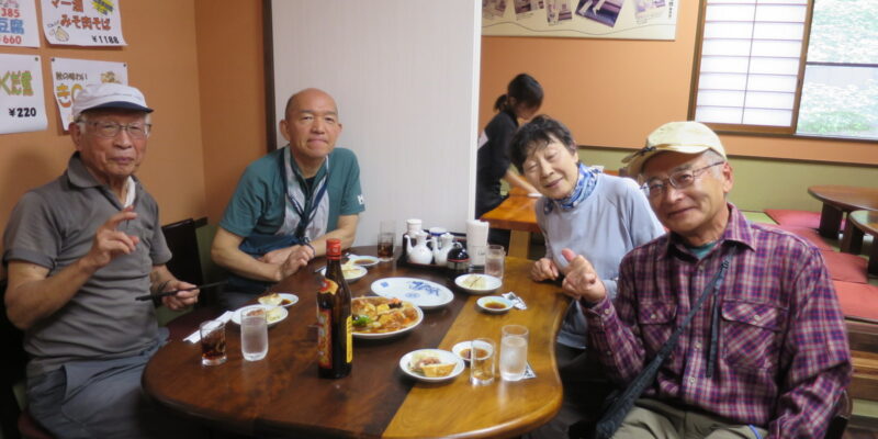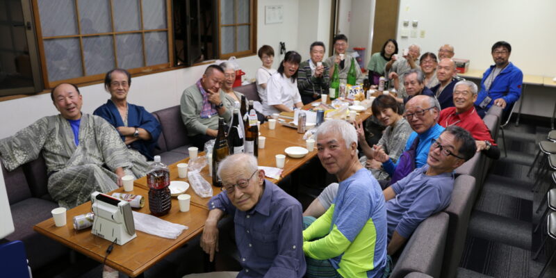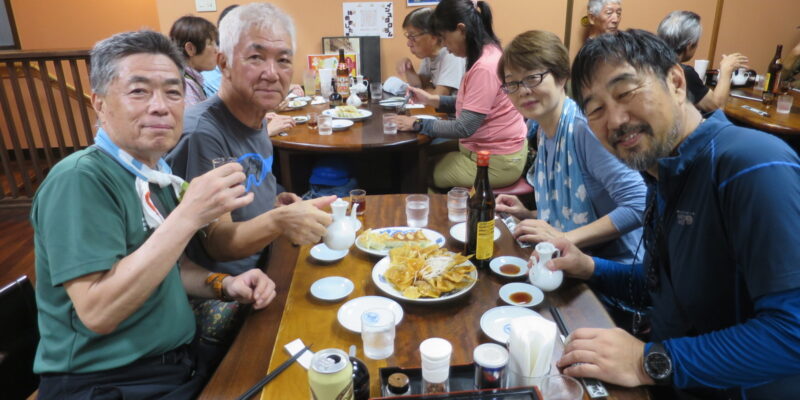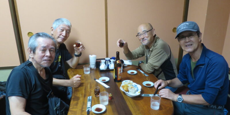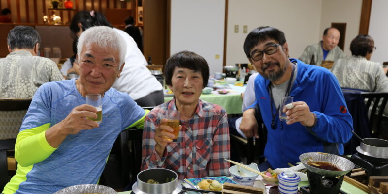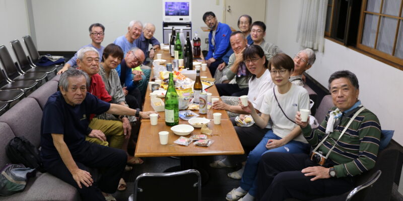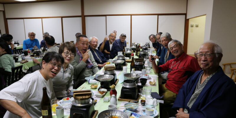 懇親会は安井代表の挨拶から始まり、美味しい食事とお酒で楽しい時間を過ごすことができた。参加者平均年齢は71歳であるがハイキングの疲れを感じさせぬパワーで大盛況の懇親会となった。この後、幹事部屋で2次会と続くのだから、皆、元気すぎる・・・・・