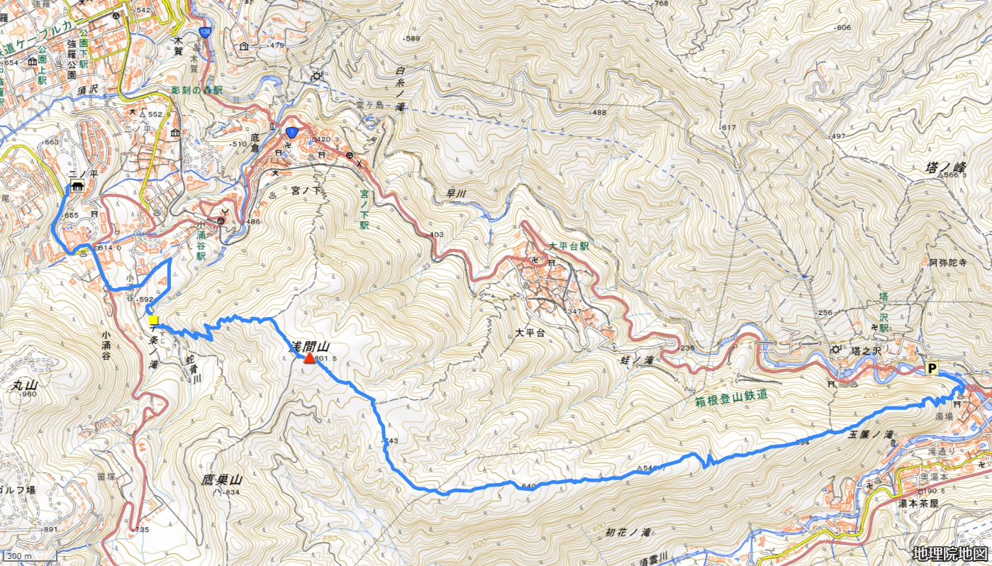 0920ヴェルデの森~0928千条(ちすじ)の滝~1010宮の下分岐~1023浅間山~1033大平台分岐~1133湯坂城址~1200国道1号~1204函嶺洞門前駐車場