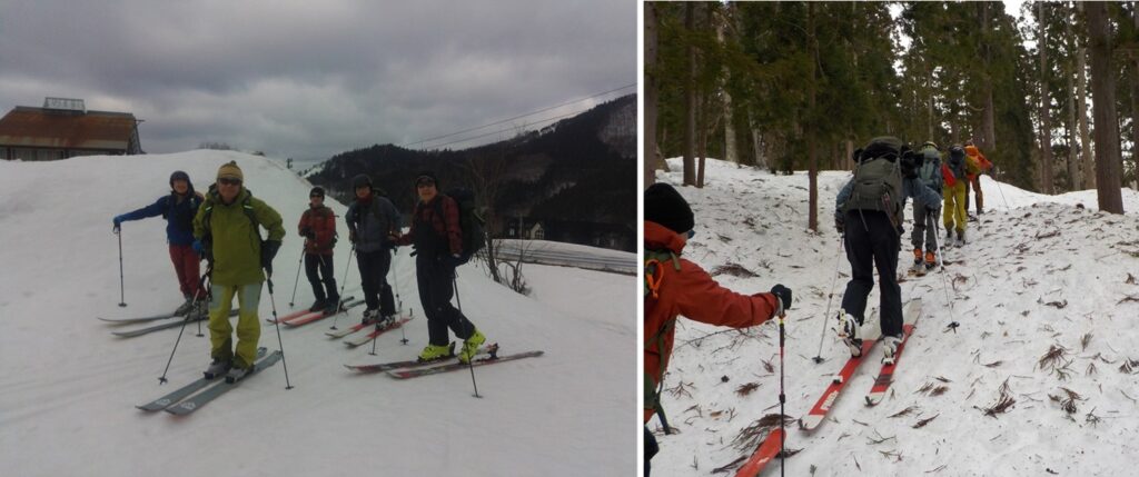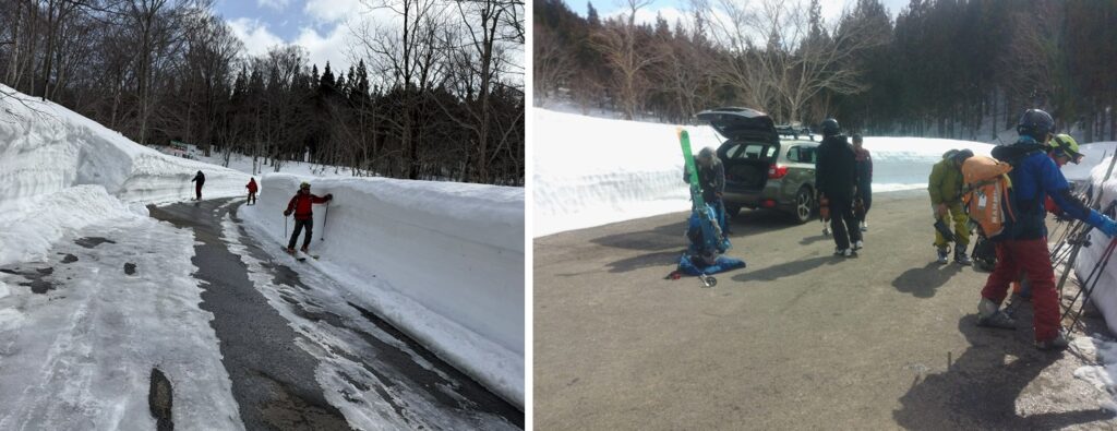 林道・市道東又線に出るとあとはテレマーク山荘まで道路沿いに下るだけである。しかし、除雪がされており、雪面が少なく苦労するが3名は頑張って道路脇斜面を滑り降り12:45に無事に車のデポ地点であるテレマーク山荘に到着する。