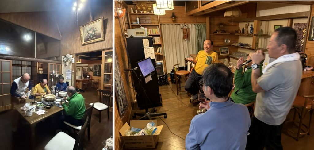 温泉につかり湯豆腐を肴に吞むは吞むは・・・その後にカラオケ大会と疲れを知らぬ猛者たち。。。私には真似ができない。