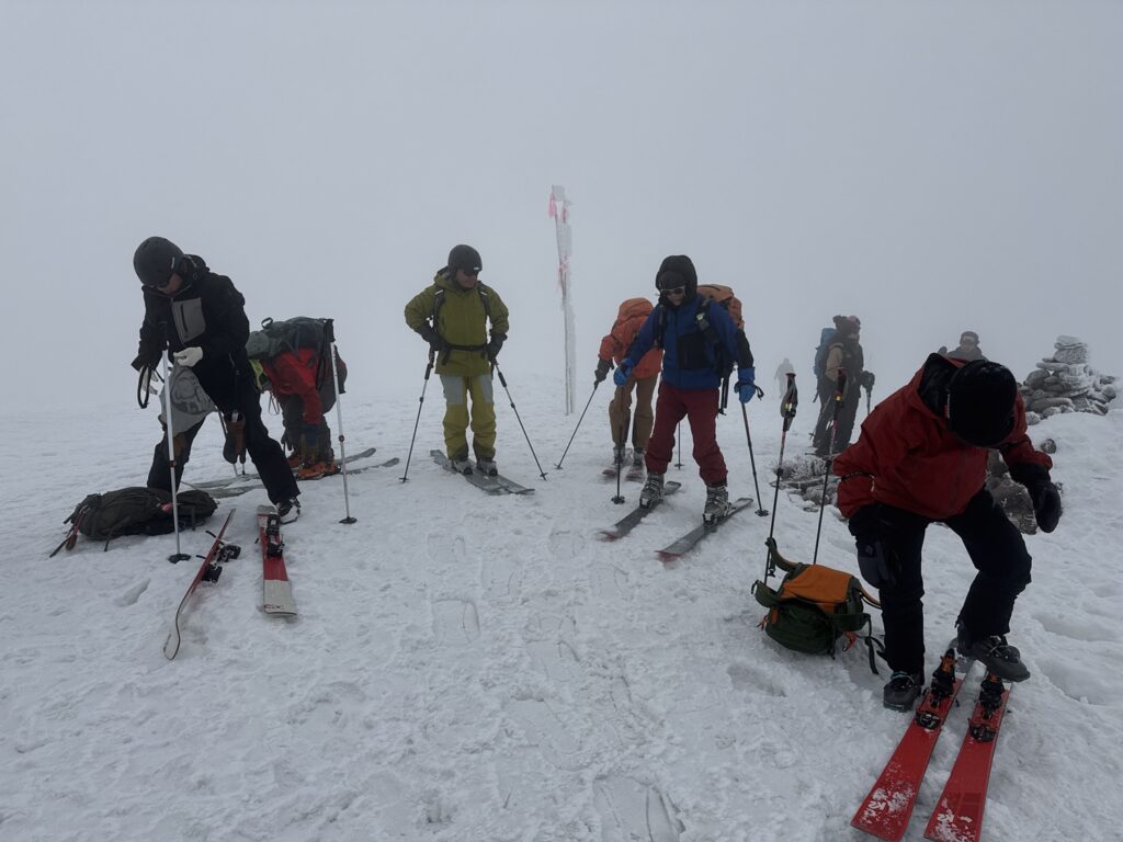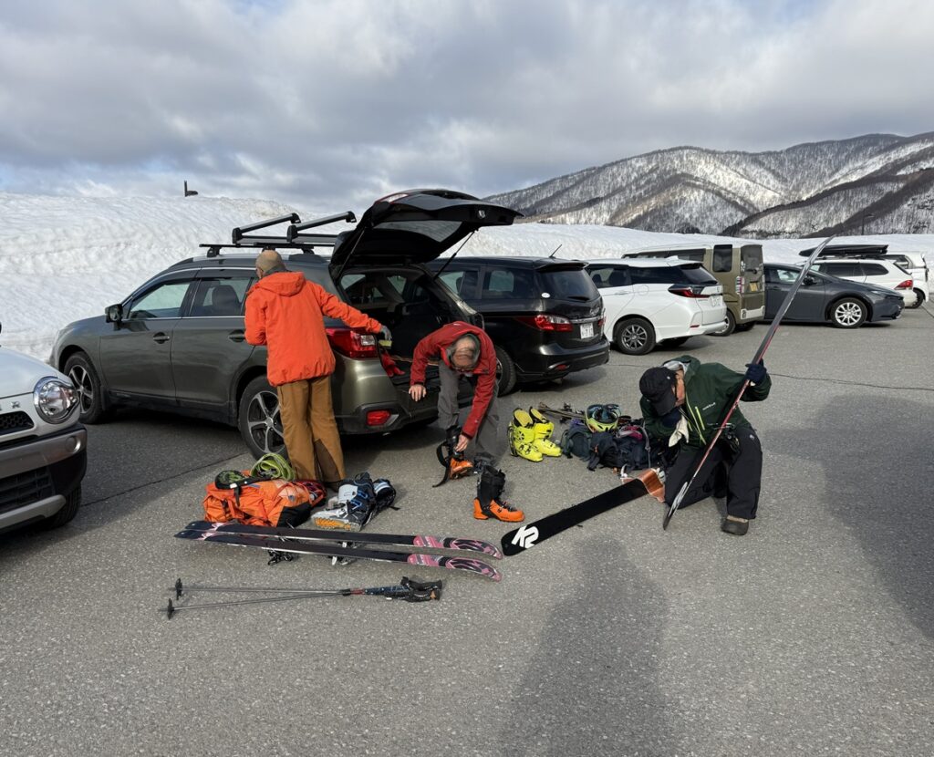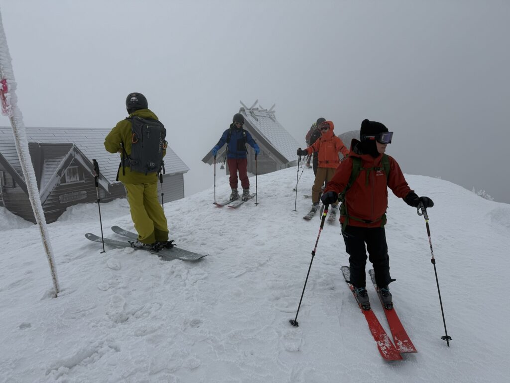 宿泊先を8:42出発、スキー場までシールで登り山麓駅でゴンドラ乗車し頂上駅まで一気に移動する。