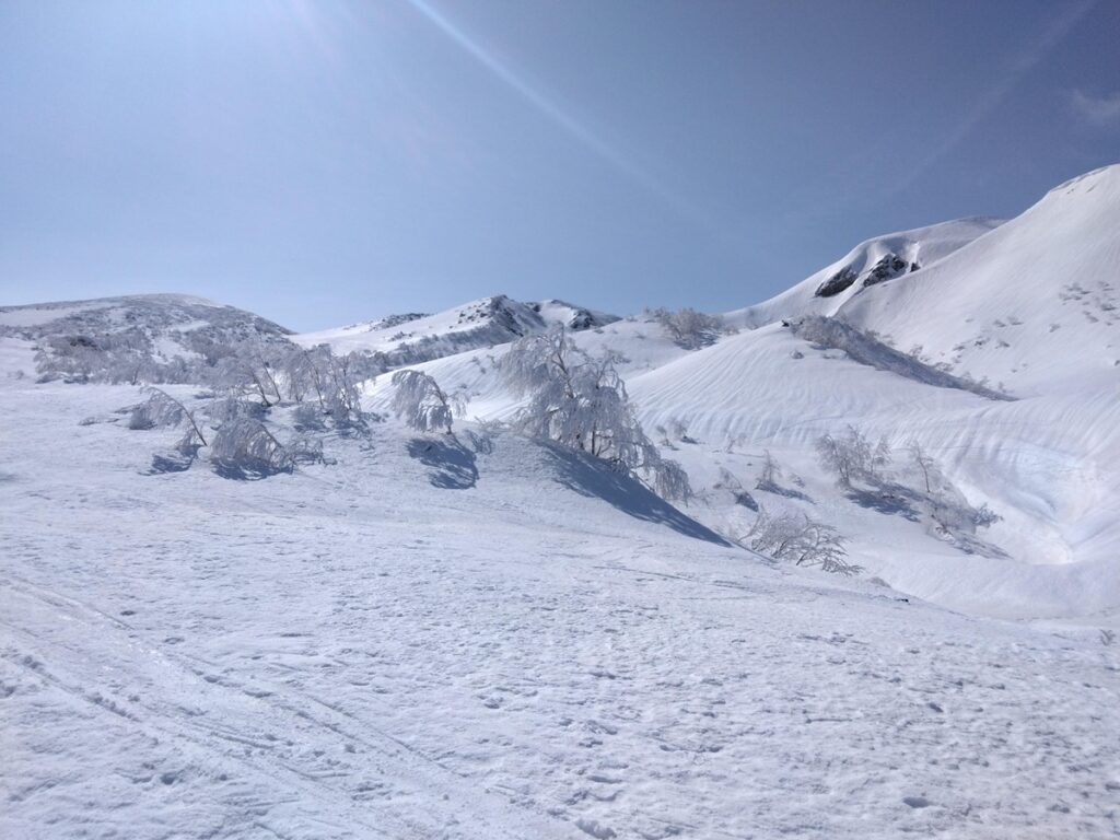 標高1,308mの石森まで登る。ここ数日、暖かい日が続いており残念ながらパウダーではない。樹氷もすっかり落ちていた。計画では松倉沢の下降であったが早い雪解けで沢の状況は悪いと判断、山頂駅経由でゲレンデを滑り降りる。