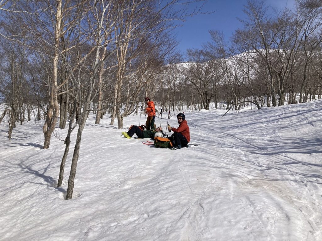 ここで休憩をとる。その後、右に張り出した雪庇に注意しながら横田尾根を下る。