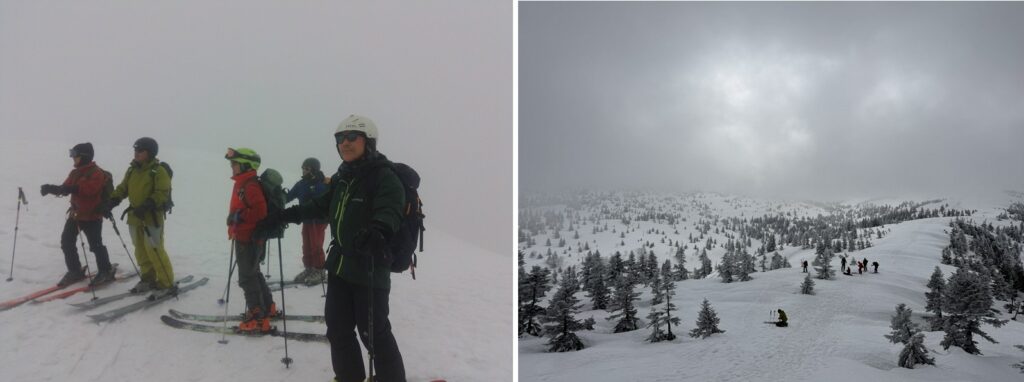 昨日の雨で予想通り雪面は固く、また視界も効かず石森まで登ってその後を判断することとした。木々は霧氷で白くなっていて幻想的であった。